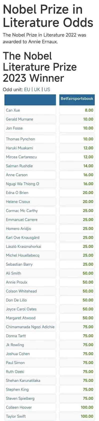 简而言之,赔率榜上排名越高,赔率越低,则代表着博彩公司对该作者获奖信心越大。在2023年的赔率榜上,当年诺奖得主约恩·福瑟就排名第三(第一仍是残雪)。