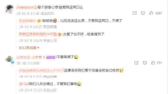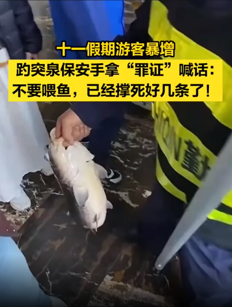 景区保安手持死鱼,苦口婆心地劝阻游客:"大家千万不要喂鱼,已经撑死好几条了,不要屠杀生灵!"为了保护这些可爱的生灵,保安们开始积极呼吁游客不要喂鱼。