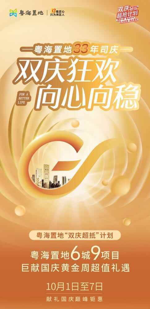 今年是粤海置地成立33周年,结合国庆节,在“止跌回稳”的官方信号下,粤海置地发布“双庆超抵”计划,既寓意着“抄底”,又有粤语中“超值”的含义,实实在在地为购房者带来折扣优惠、礼包赠送等高价值福利,广州、佛山、珠海、中山、江门、惠州等多个城市项目参与其中。