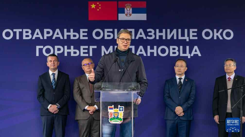 10月4日,在塞尔维亚中部城市上米拉诺瓦茨,塞尔维亚总统武契奇(前)在中企承建的绕城公路通车仪式上致辞。新华社发(王韡摄)