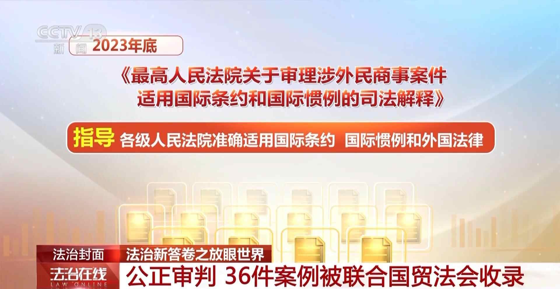 2023年底,最高人民法院发布审理涉外民商事案件适用国际条约和国际惯例的司法解释,指导各级人民法院准确适用国际条约、国际惯例和外国法律,审结了一批有规则指引意义的涉外商事案件。目前,已有36件案例被联合国贸法会法规判例法数据库收录,有力阐释了我国的涉外法治理念。