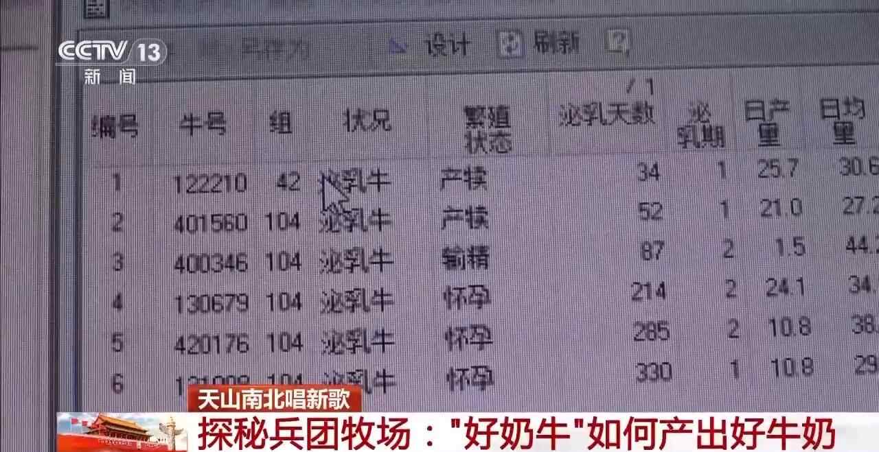 总台央视记者 陈允涛:在新疆生产建设兵团第十二师天润乳业北亭万头牧场,这块大屏幕就是奶牛场的智能管理系统,每一头奶牛的健康状况都可以实时监控。