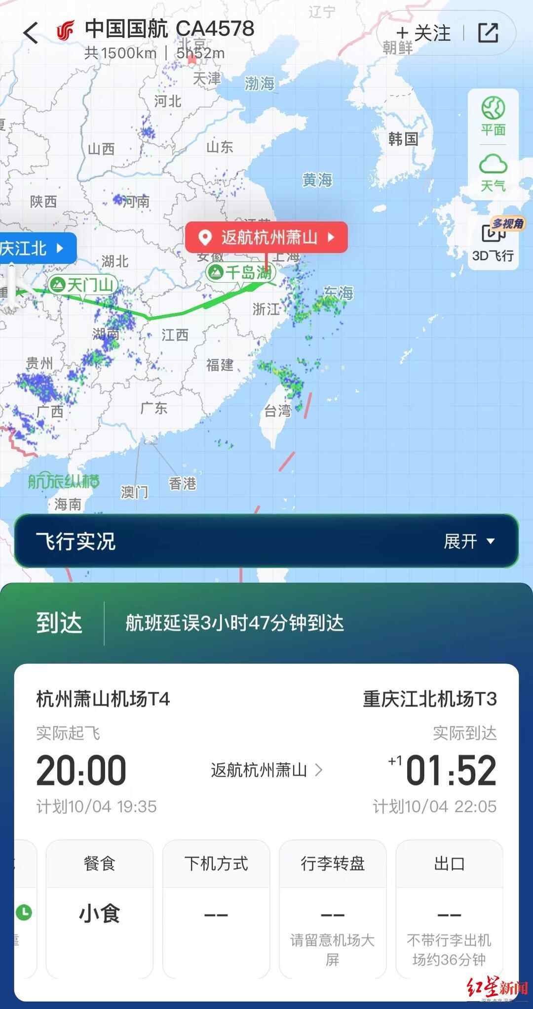 记者从飞常准、航旅纵横等航空出行类应用提供的信息上看到,4日晚上由杭州萧山机场飞往重庆江北机场的国航CA4578次航班计划当晚7点35分起飞,实际8点起飞,但是在中途出现返航杭州萧山机场的情况,返航的航班在9点15左右降落萧山机场。