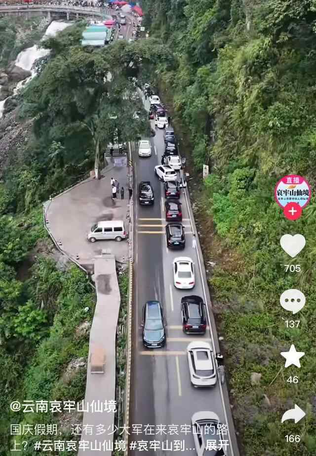 10月5日,@云南哀牢山仙境 发布一则航拍的哀牢山上山车道视频,并发问,“国庆假期,还有多少‘大军’在来哀牢山的路上?”视频显示,绕山而上的路上全是小汽车,已经堵得动弹不得。