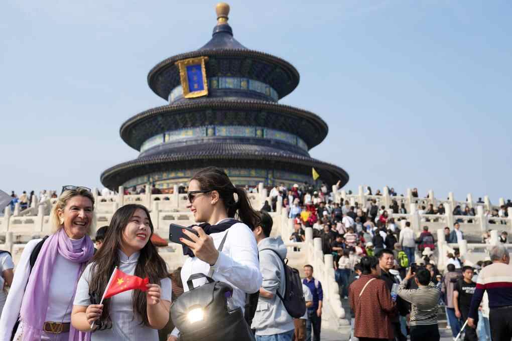 10月5日,游客在天坛公园祈年殿前游览。新华社记者 鞠焕宗 摄