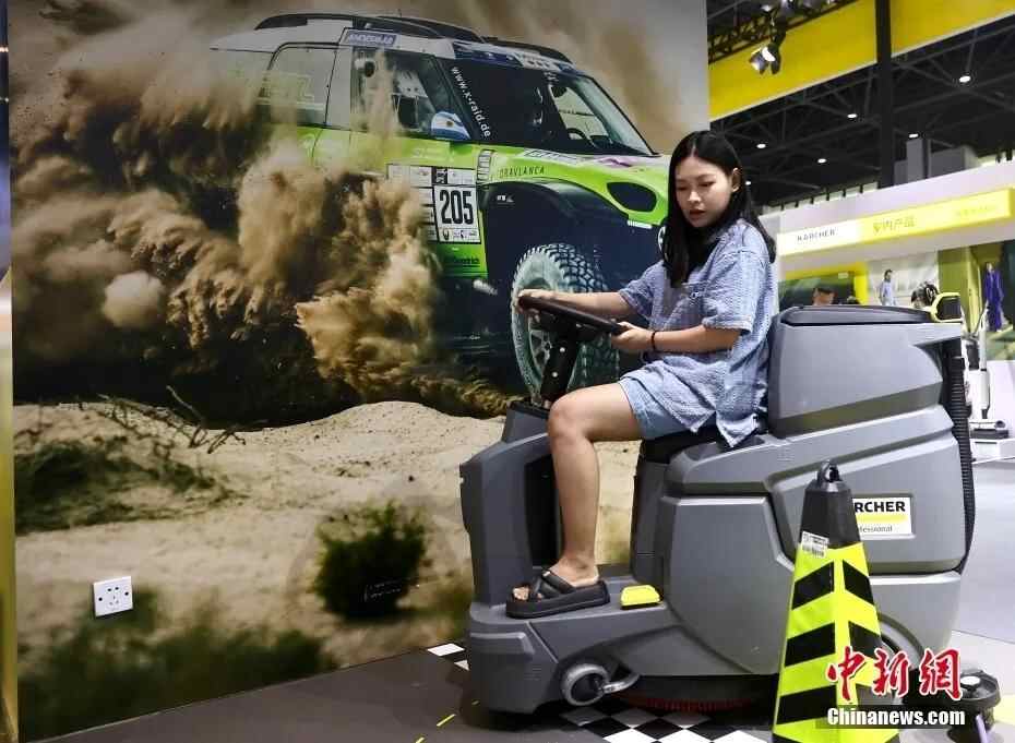 2024年4月15日,正在海南海口举办的第四届中国国际消费品博览会上,德国企业的展馆吸引了不少参观者前来参观、选购商品。图为参观者在一家德国清洁用品企业展馆体验清洁机车。中新社记者 易海菲 摄