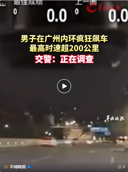 一名司机在广州内环线上驾车狂飙,最高时速超过200公里,全程26公里多的路程耗时不到10分钟,司机还连呼“好爽”?10月9日,这样一段视频被上传到网络平台。10日,广州交警表示,他们已注意到此事,正在调查。