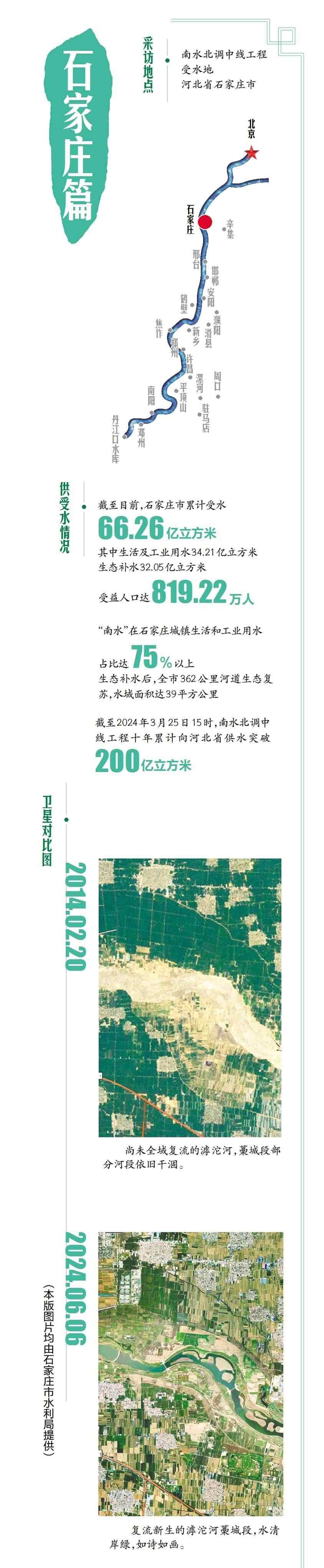 “南水”在石家庄城镇生活和工业用水占比达75%以上。生态补水后,全市362公里河道生态复苏,水域面积达39平方公里。