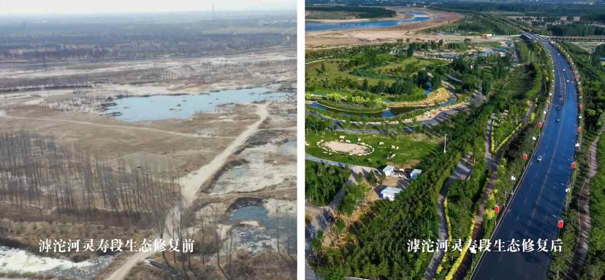 滹沱河灵寿段生态修复前后对比图。(石家庄市水利局 供图 )