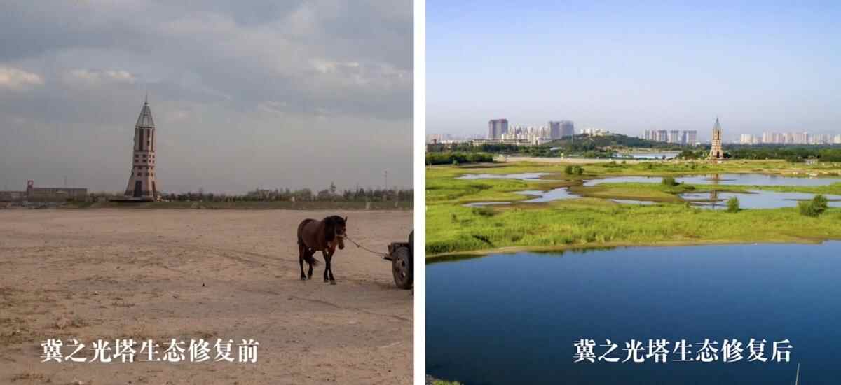 滹沱河塔之光生态修复前后对比图。(石家庄市水利局 供图 )