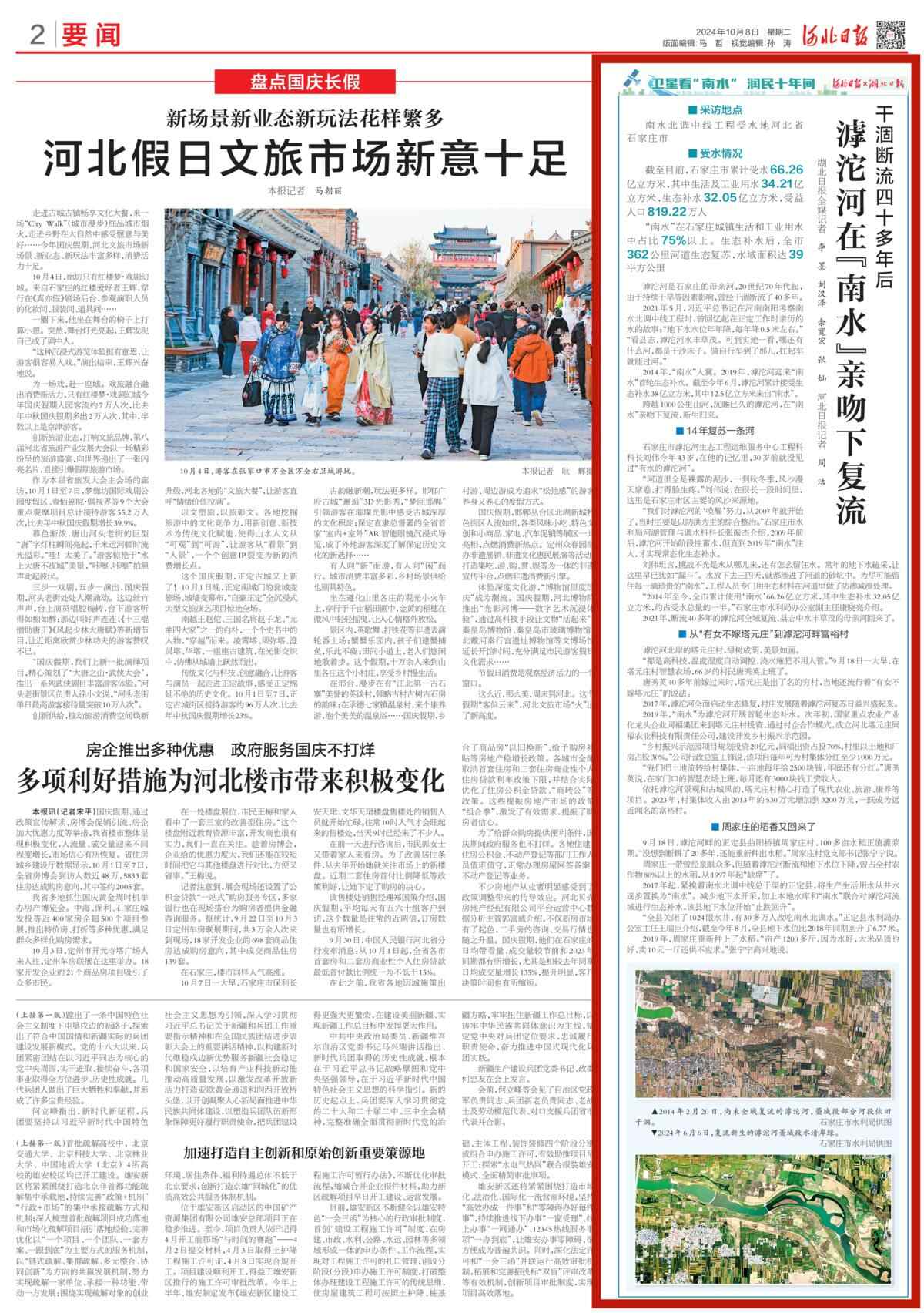 “光是滹沱河就补了12.5亿立方米,此外,‘南水’对沙河、槐河和洨河等也有常态化或相机补水。”张振杰说,除了水量的补给,清澈的“南水”还极大地改善了受水河湖的水质。