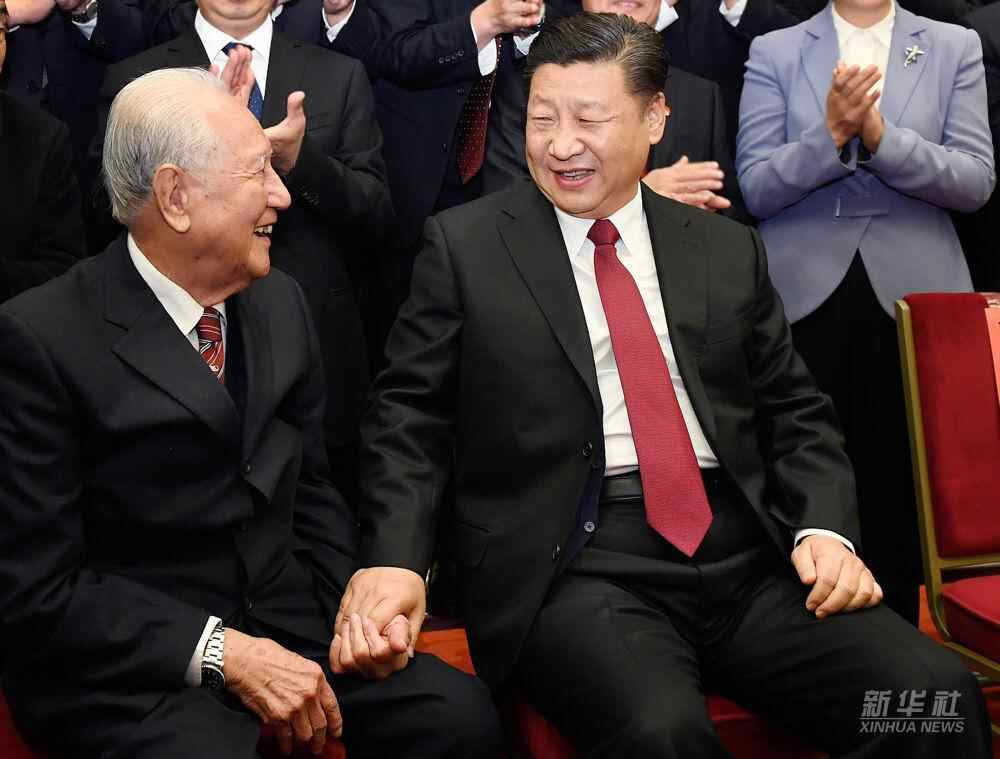 2017年11月17日,全国精神文明建设表彰大会在北京人民大会堂举行。这是习近平邀请黄旭华、黄大发代表坐在自己身边合影。新华社记者 李学仁 摄