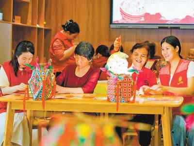 福建省福州市鼓楼区推动社区食堂和文化服务融合,丰富老年人生活。图为一家社区食堂内,志愿者和老人们一起学习非遗技艺。