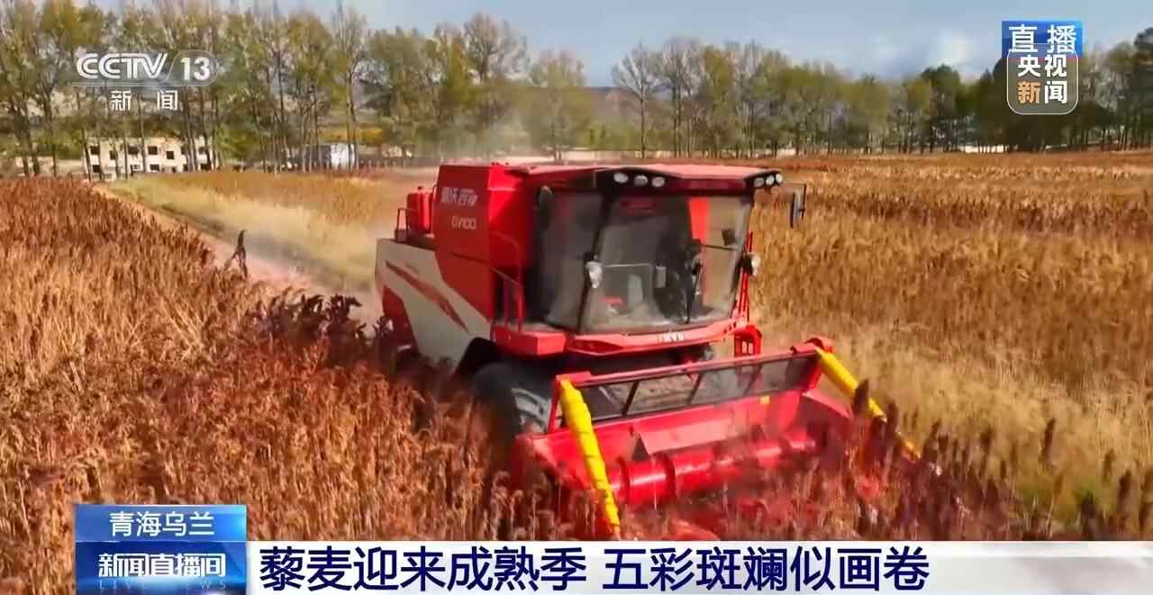 总台记者 崔建军:我现在所在的位置是乌兰县的一块藜麦标准化种植示范基地,这里种植的千亩藜麦已经成熟。从空中俯瞰,不同品种藜麦成熟的麦穗呈现出火红、金黄、紫红等色彩,整块田地宛如一幅天然油画,美不胜收。