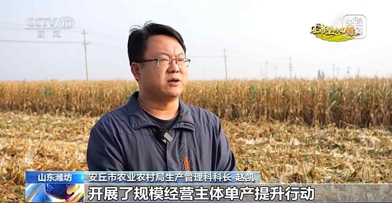 安丘市农业农村局生产管理科科长 赵凯:今年,我们在玉米生产方面开展了规模经营主体单产提升行动,组织48个种粮大户、家庭农场等经营主体参与,面积达到了15000亩。产量达到了(亩产)700公斤左右。