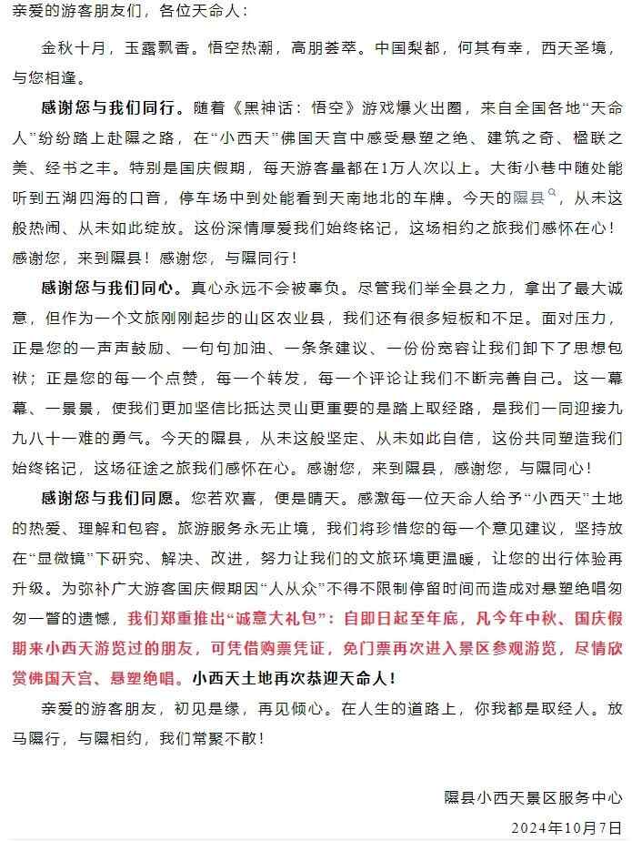 10月3日,隰县文化和旅游局发出《再致小西天广大天命人的一封信》,信中说“隰县是山区农业县,正在努力转型旅游城”。