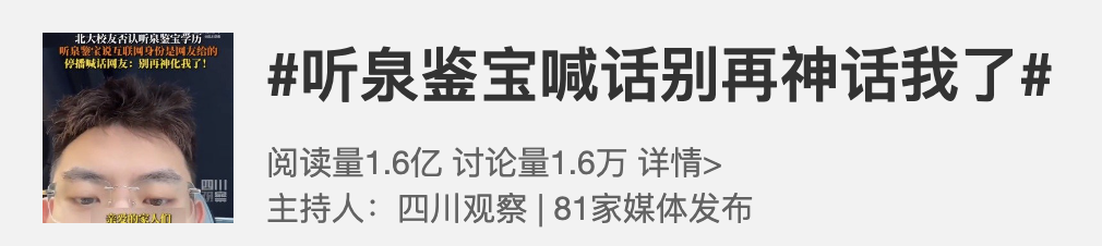 然而,在获取泼天流量的同时,“听泉鉴宝”被曝学历造假、直播间疑现馆藏文物(博物馆文物)、疑盗墓者现场连麦求鉴宝等问题,相关话题也频频冲上热搜。10月14日,话题#听泉鉴宝喊话别再神话我了#登上热搜,“听泉鉴宝”回应网友质疑学历问题:“互联网身份是网友给的。”