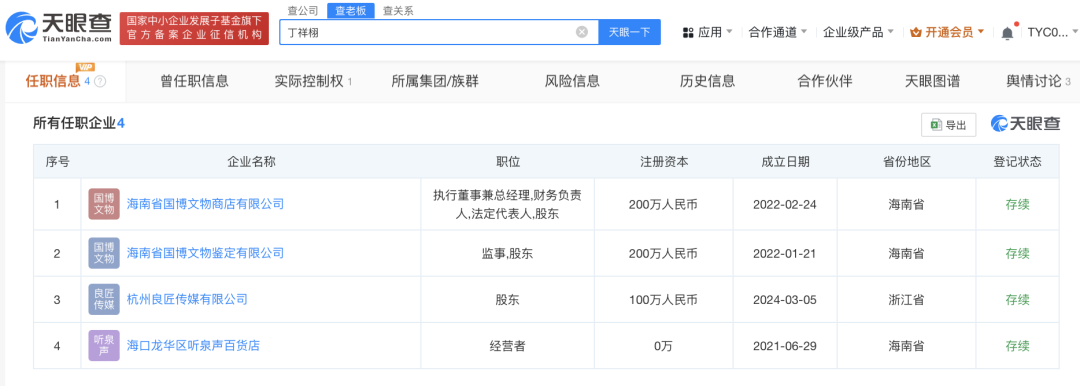 此外,企查查官网显示,该账号实名认证所绑定的丁祥栩,名下在海南共关联了4家企业,均为存续状态。值得一提的是,由他持股49%的杭州良匠传媒有限公司,目前已申请注册多枚商标,如“听泉鉴宝”“听泉严选”“听泉甄选”“听泉优选”等,国际分类涉及广告销售、珠宝钟表等,当前状态均为等待实质审查。该公司还登记了“听泉鉴宝”“听泉寻宝”作品著作权和软件著作权。