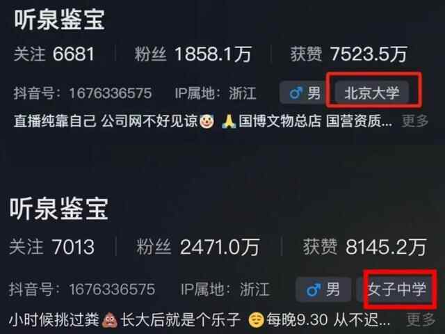 10月12日,抖音账号“听泉鉴宝”的实名认证信息为丁祥栩,账号的学校信息也由此前的“北京大学”改为了“女子中学”。有记者从北京大学考古文博学院的某位校友处获悉,丁祥栩并非该院毕业生。