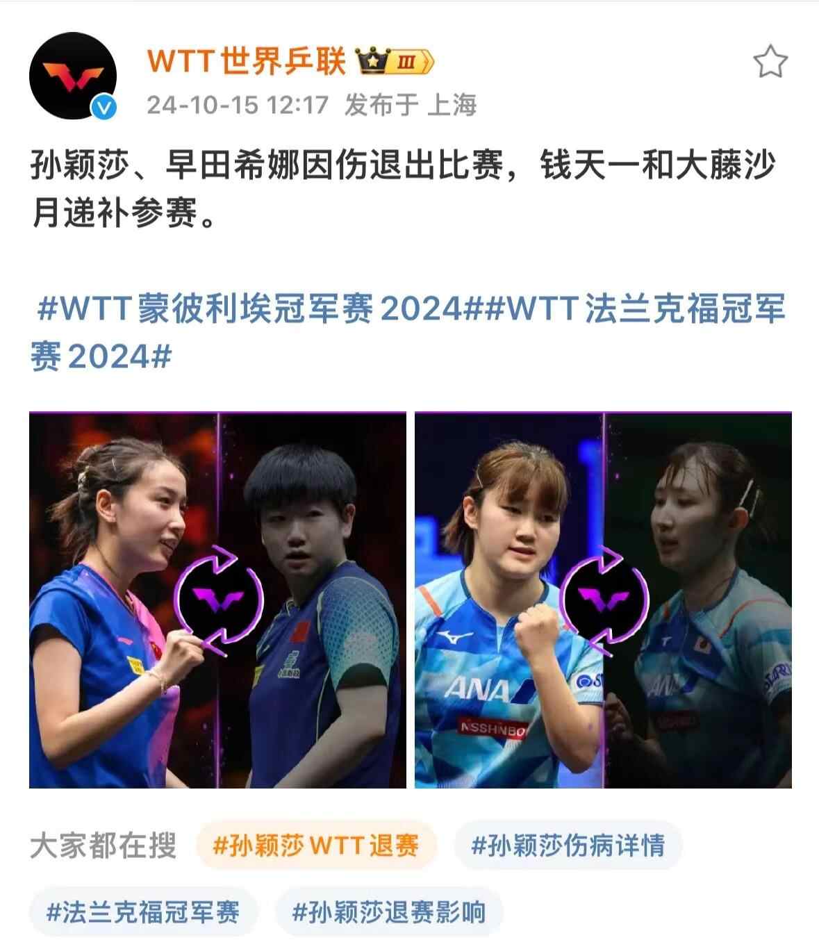 此前,WTT世界乒联官方宣布,孙颖莎因伤退出接下来进行的WTT冠军赛蒙彼利埃和法兰克福两站赛事,钱天一将递补参赛。