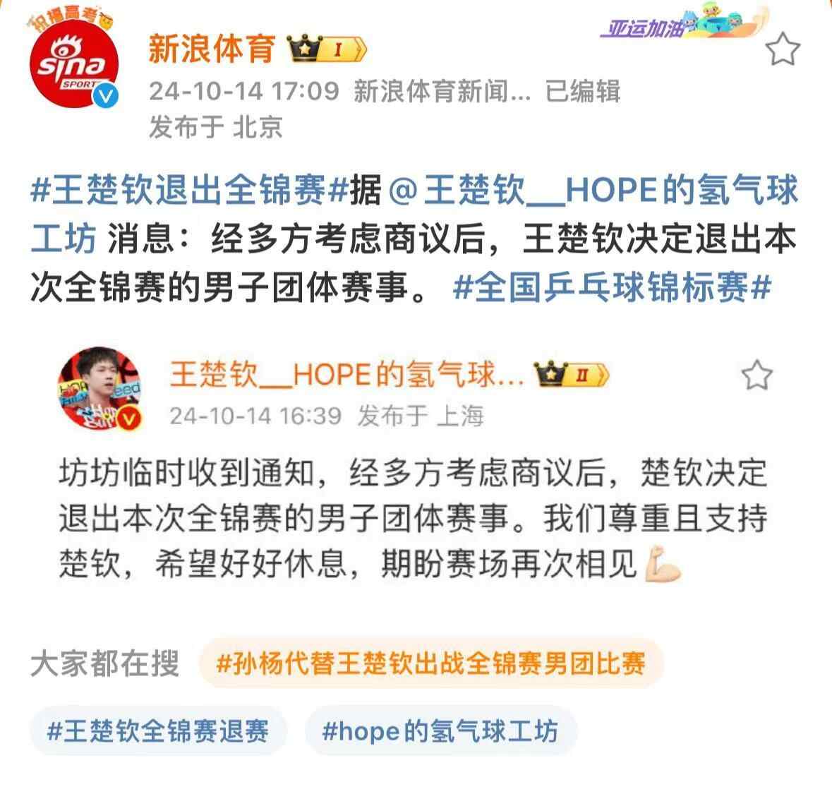 同样宣布退赛的,还有国乒主力队员王楚钦。