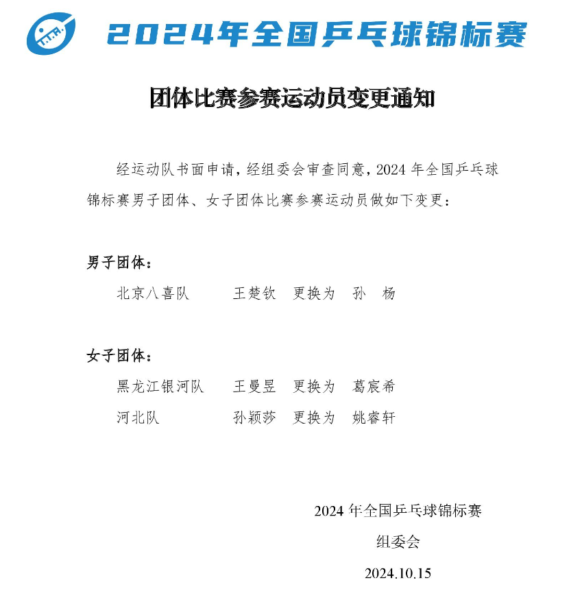 10月15日,全国乒乓球锦标赛组委会发布《2024年全国乒乓球锦标赛团体比赛参赛运动员变更通知》,宣布王楚钦(北京八喜队)、王曼昱(黑龙江银河队)、孙颖莎(河北队)三人退出比赛,他们在团体赛中的位置分别被孙杨、葛宸希、姚睿轩取代。