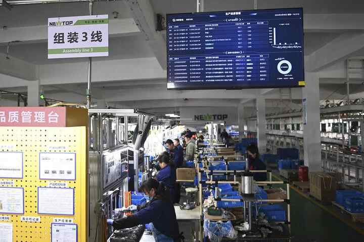 2024年3月18日,在位于嘉兴市的浙江善拓机械有限公司内,数字屏幕实时呈现生产进度管理信息。新华社记者 黄宗治 摄