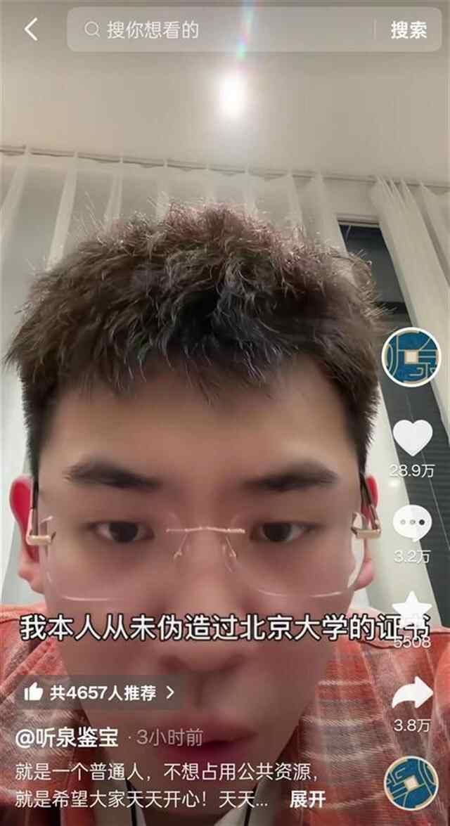 网红“听泉鉴宝”被网友质疑学历造假,10月15日凌晨5点多,听泉鉴宝发视频回应称:从未说过自己是北大的,学历信息是账号注册时填写的,自己从未伪造北京大学的证书,也没有在直播以及任何地方使用北京大学的标签。记者注意到,听泉鉴宝的主页个人信息已改为“女子中学”,性别也改为女性。