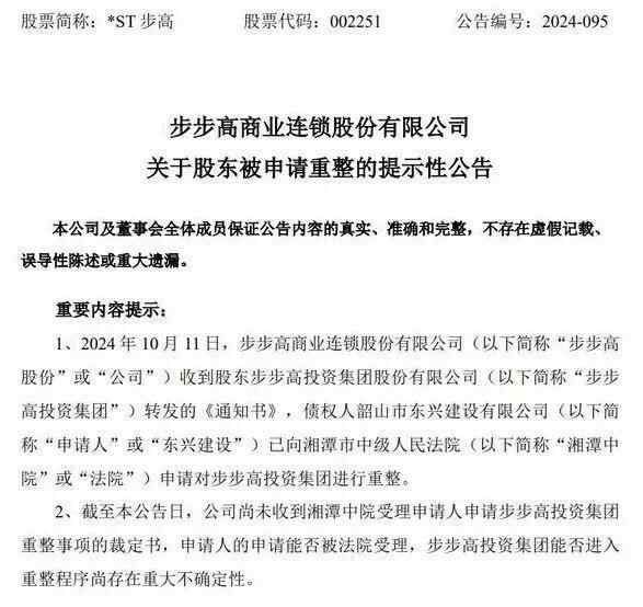 天眼查法律诉讼信息显示,10月11日,*ST步高(002251)母公司步步高投资集团股份有限公司新增一则破产审查案件,申请人为韶山市东兴建设有限公司,经办法院为湖南省湘潭市中级人民法院。