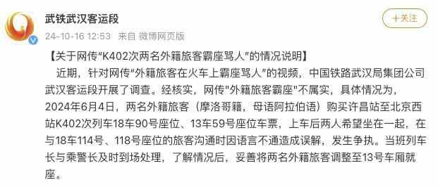 10月16日,@武铁武汉客运段 发布《关于网传“K402次两名外籍旅客霸座骂人”的情况说明》,内容如下: