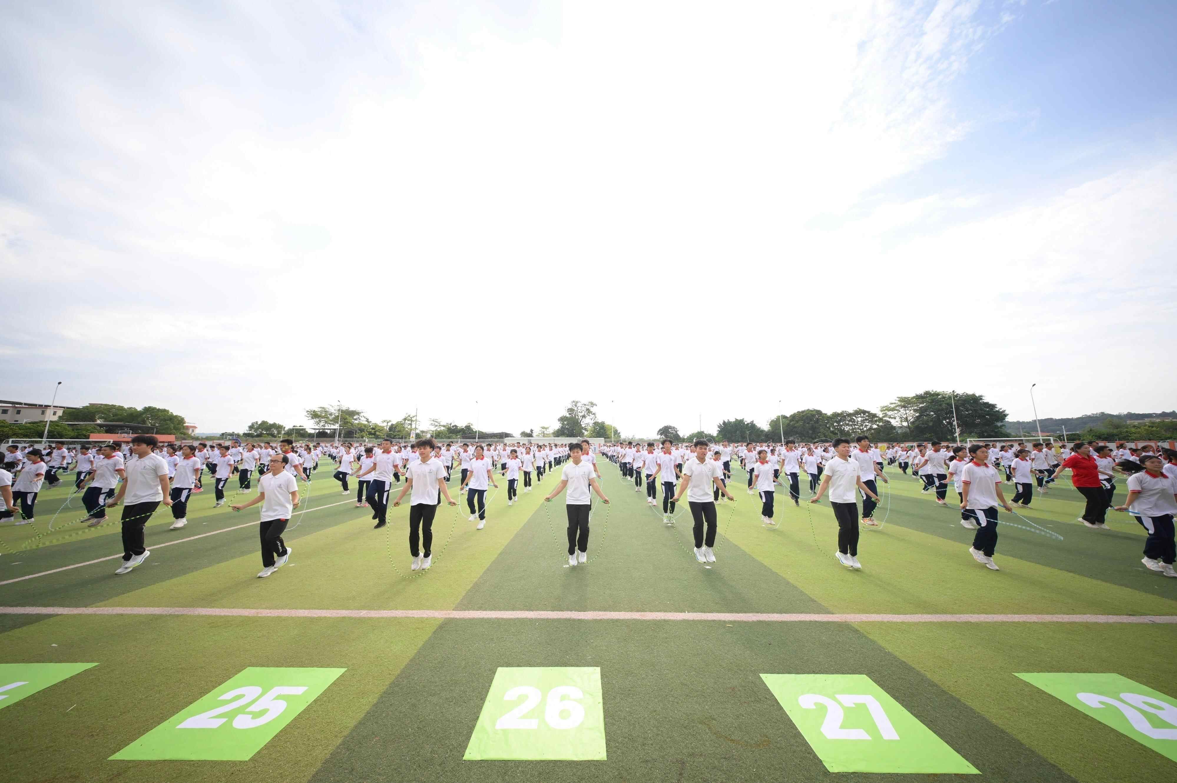 随着发令枪响,操场上顿时绳影翻飞,脚步轻盈。1100名青少年在岑小林、谢凯宇、张崇杨等8位世界冠军及花都跳绳梦之队的带领下,同步摇动跳绳,双脚交替跳跃,场面蔚为壮观。