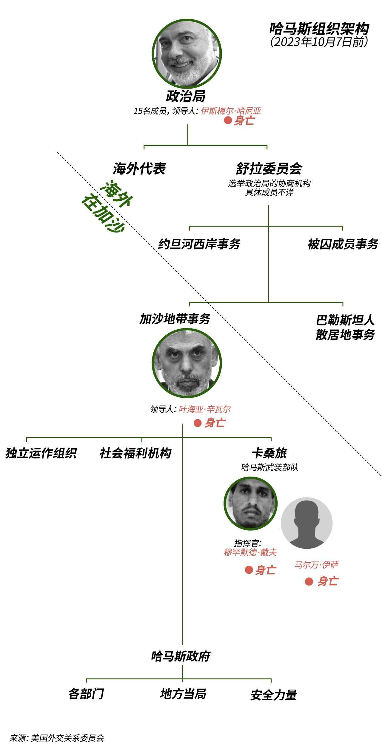 英国广播公司(BBC)在去年新一轮巴以冲突开始时曾指出,哈马斯领导层有7位核心人物,目前已有4位核心人物遇袭身亡。除辛瓦尔外,哈马斯政治局领导人伊斯梅尔·哈尼亚(Ismail Haniya)当地时间7月31日在伊朗遇刺身亡;以色列军方8月1日确认,哈马斯军事部门首领、卡桑旅领导人穆罕默德·戴夫(Mohammed Deif)于7月13日在以军对加沙地带汗尤尼斯地区的空袭中死亡。另外,以色列军方今年3月称,哈马斯卡桑旅副首领马尔万·伊萨(Marwan Issa)已在空袭中身亡。