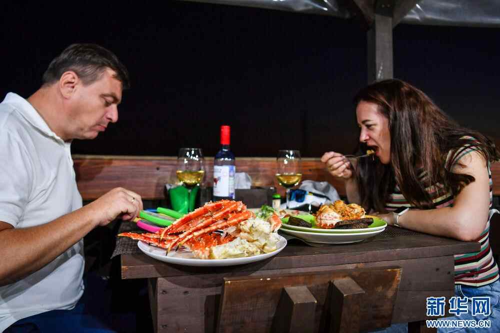 食客们在俄罗斯符拉迪沃斯托克的一家餐馆品尝帝王蟹。