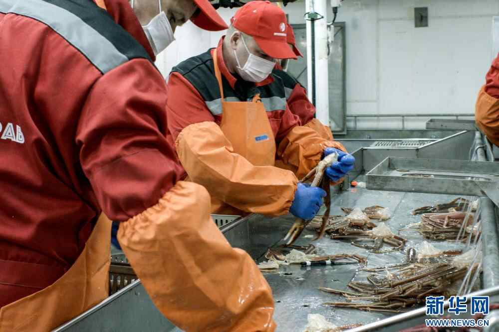 俄罗斯蟹业集团的工作人员在生产线上加工产品。