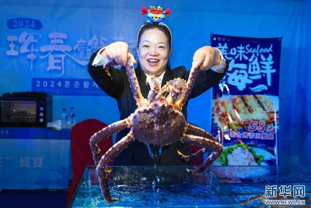 游客在吉林省珲春市的2024珲春帝王蟹美食嘉年华现场游玩。
