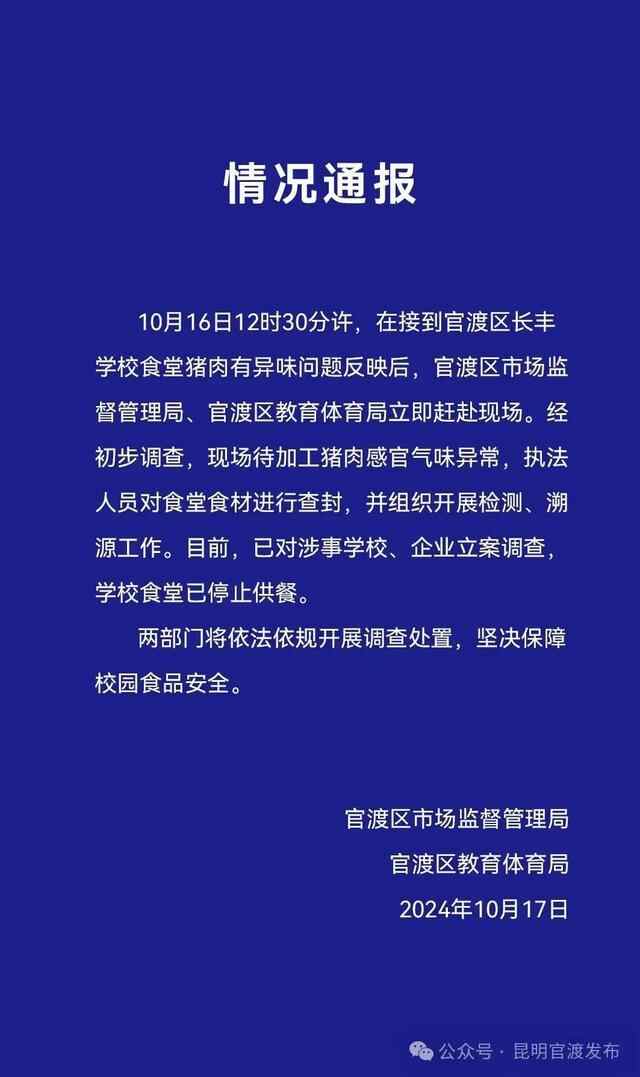 通报称,10月16日12时30分许,在接到官渡区长丰学校食堂猪肉有异味问题反映后,官渡区市场监督管理局、官渡区教育体育局立即赶赴现场。经初步调查,现场待加工猪肉感官气味异常,执法人员对食堂食材进行查封,并组织开展检测、溯源工作。