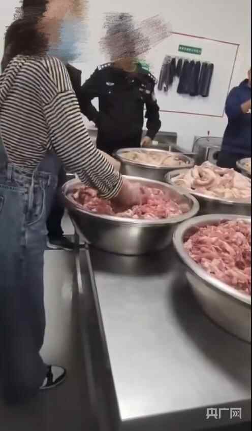 学生家长发布的视频显示,家长们聚集在学校食堂后厨工作间内,工作台上摆放着几个不锈钢大盆,每个大盆中都装满了肉。“这个闻着更臭,你们来闻闻到底有多臭。”一家长戴着塑料手套从盆中抓起一把肉说道。还有家长对食堂工作人员说:“整盆肉都是臭的,我看你们怎么炒给小孩们吃!”“你们良心不会痛吗?”