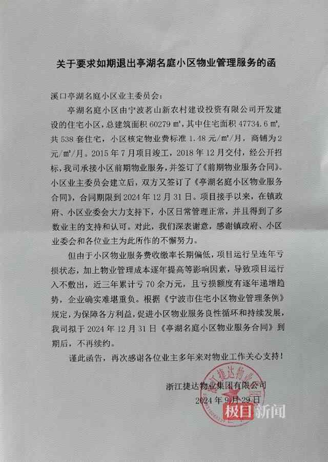 宁波市亭湖名庭小区物业属于浙江捷达物业集团有限公司。今年9月底,该公司发布通知称,由于小区物业服务费收缴率偏低,近三年累计亏损70余万元,该公司拟于2024年12月31日合同到期后,不再续约。公告中提到,小区于2018年12月交付,总建筑面积60279平方米,其中住宅面积47734.6平方米,共538套住宅。小区核定物业费标准为每月1.48元/平方米,商铺为每月2元/平方米。
