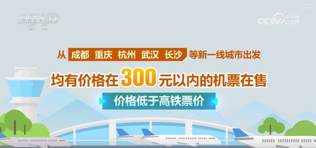 从成都、重庆、杭州、武汉、长沙等新一线城市出发,均有价格在300元以内的机票在售,价格低于高铁票价。