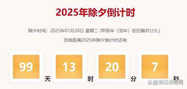 今天(10月20日),距离2025年蛇年除夕还有99天,过年倒计时进入2位数。今年除夕在2025年1月28日,农历为腊月二十九,依旧是没有农历大年三十的除夕。一年的时间转瞬即逝,网友们纷纷感慨时间过得太快了。