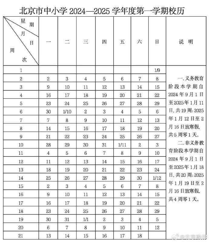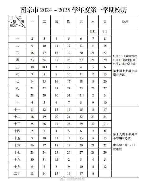 2024年9月1日(星期日)开学;2025年1月18日(星期六)结束本学期工作,共20周;2025年1月19日(星期日)至2月16日(星期日)放寒假,共4周零1天。