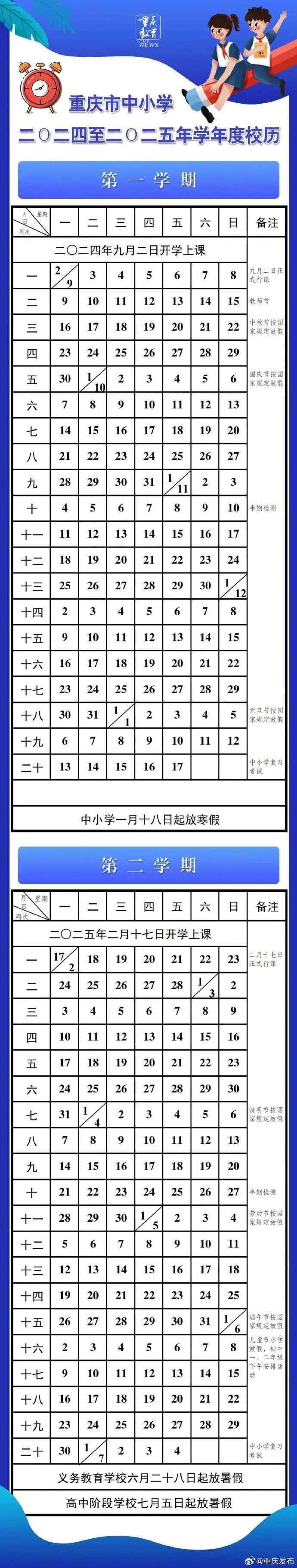 根据重庆市教委此前发布的《重庆市中小学2024-2025年学年度校历》,第一学期2024年9月2日(星期一)开学行课,2025年1月18日(星期六 农历腊月十九)起放寒假。