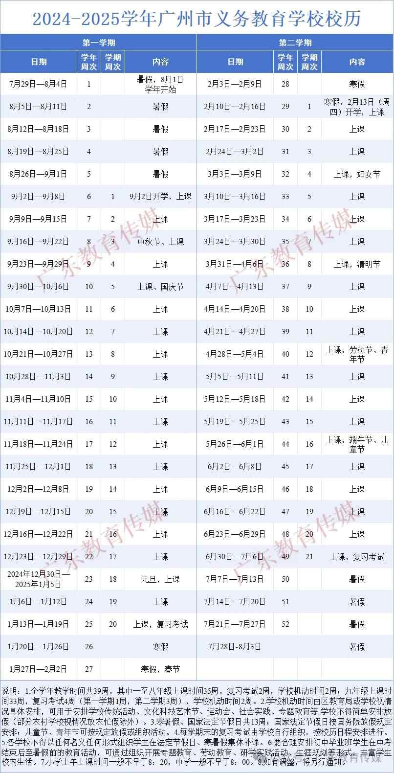 2024年9月1日(星期日)开学;2025年1月11日(星期六)结束本学期工作,共19周;2025年1月12日(星期日)至2月16日(星期日)放寒假,共5周零1天。