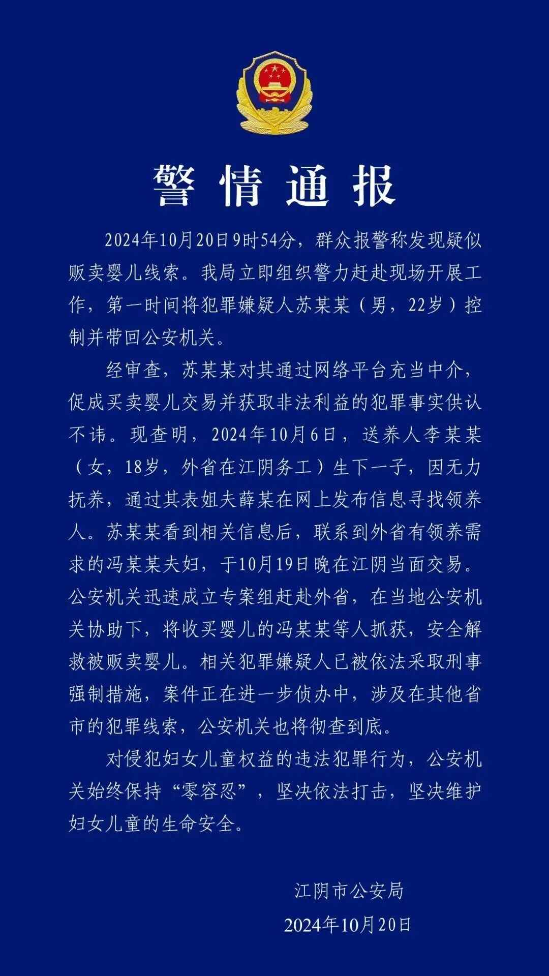 10月20日9时54分,群众报警称发现疑似贩卖婴儿线索。江阴市公安局立即组织警力赶赴现场开展工作,第一时间将犯罪嫌疑人苏某某(男,22岁)控制并带回公安机关。
