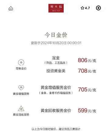 记者查询各品牌官方小程序发现,截至10月20日,周大福足金饰品、工艺品类零售金价为806元/克;周生生足金饰品为803/克;老凤祥(600612.SH)上海地区足金零售价报价801元/克;六福珠宝足金首饰806元/克。