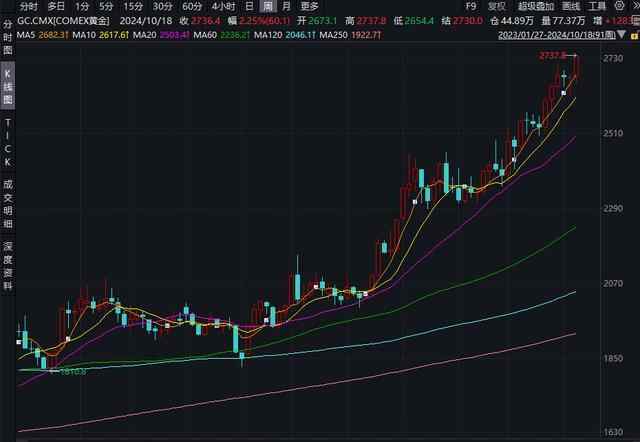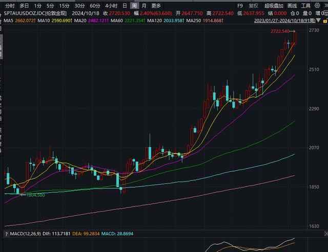 近日,黄金市场表现强劲并创新高。伦敦金现、COMEX黄金均在10月18日突破2700美元/盎司关口,最终分别收报2720.53美元/盎司、2736.4美元/盎司,本周涨幅分别为2.4%、2.25%。