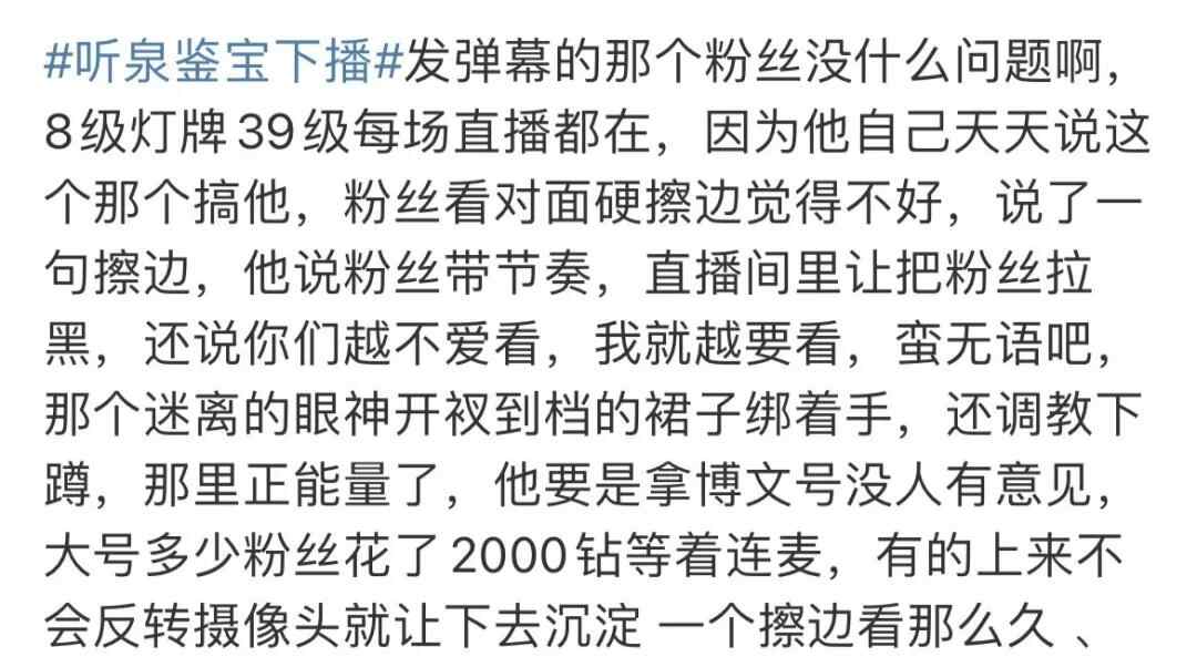 直播途中,有粉丝发弹幕称“对面擦边观感不好”“到底是赏宝还是擦边”,听泉认为是粉丝在带节奏,直播途中将该粉丝拉黑,还称“你们越不爱看,我就越要看”,随后又一言不合光速下播。