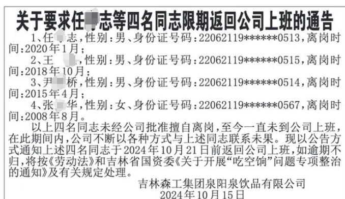 这份《关于要求任守志等四名同志限期返回公司上班的通告》称,任守志、王亮、尹世桥、张玉华四名同志未经公司批准擅自离岗,至今一直未到公司上班,在此期间内,公司不断以各种方式与上述同志联系未果。现以公告方式通知上述四名同志于2024年10月21日前返回公司上班,如逾期不归,将按《劳动法》和吉林省国资委《关于开展“吃空饷”问题专项整治的通知》及有关规定处理。