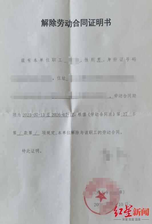 另外,在其提供的一份盖有公司鲜章的解除劳动合同证明书上,记者看到,吴先生此前为一央企公司职工,原本的劳动合同期限为2023年7月13日至2026年7月12日,但在今年7月10日时双方解除了劳动合同关系。此外,吴先生还向记者提供了他的社保参保信息,证明其近一年都在该企业就职。