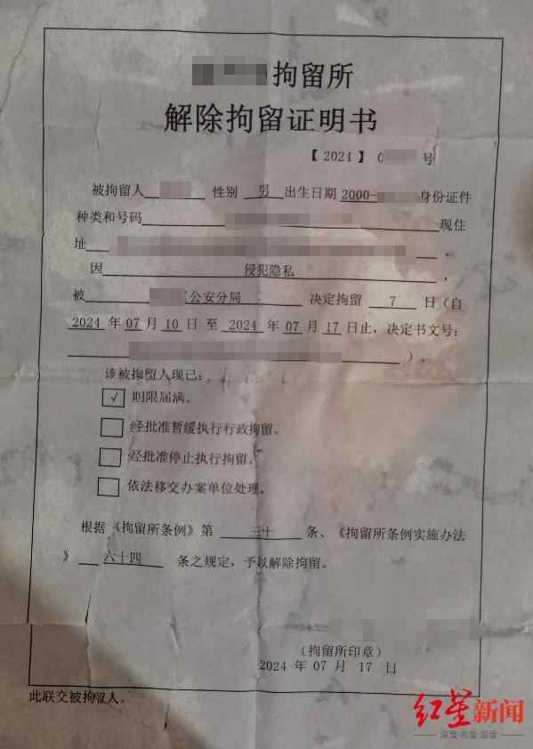 据吴先生提供的解除拘留证明书显示,7月10日,他因侵犯隐私被浙江某公安分局决定拘留7日;7月17日期限届满,根据《拘留所条例》等相关规定,予以解除拘留。